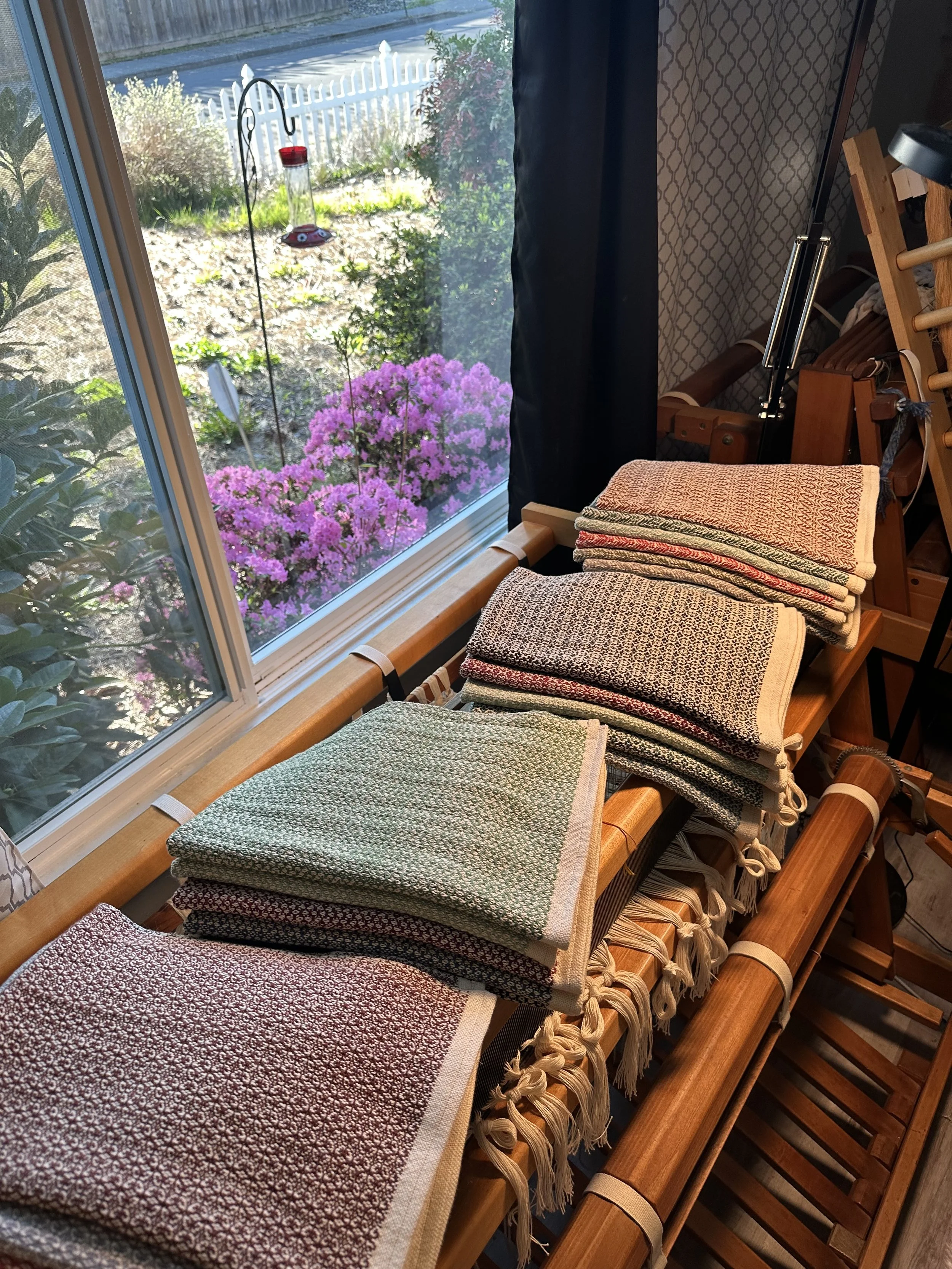 I have been on the road for the last 5 days. I travel to visit elderly parents, and I travel in a campervan. This allows me to work while I’m on the road. I have forgotten to take pictures of setting up my travel loom, but I have taken photos of the towels I completed before I left home. Just know that behind the scenes, I am working on getting new product listed, and made! (Click here to see new towels!)